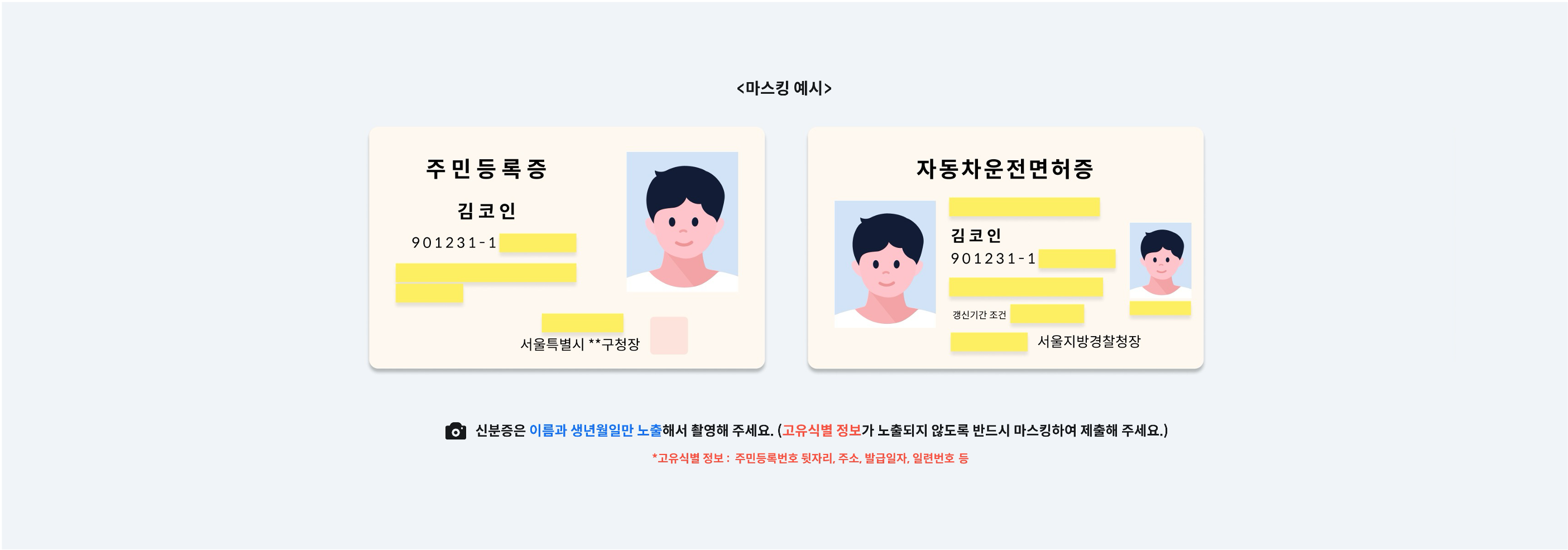 신분증의 사진, 이름, 생년월일이 식별 가능해야 하며, 그 외 모든 정보는 마스킹 처리가 필요 합니다.