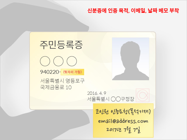신분증에 정보(1.인증 목적, 2.이메일, 3.날짜)를 기입한 메모를 부착합니다.