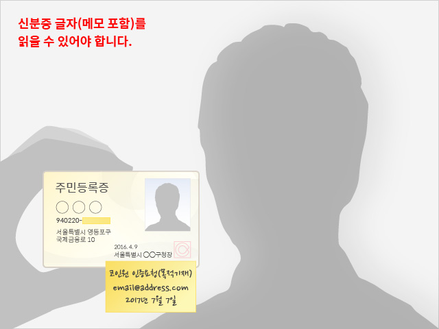 사진은 신분증의 정보 및 메모가 식별가능할 정도로 해상도가 있어야 합니다.