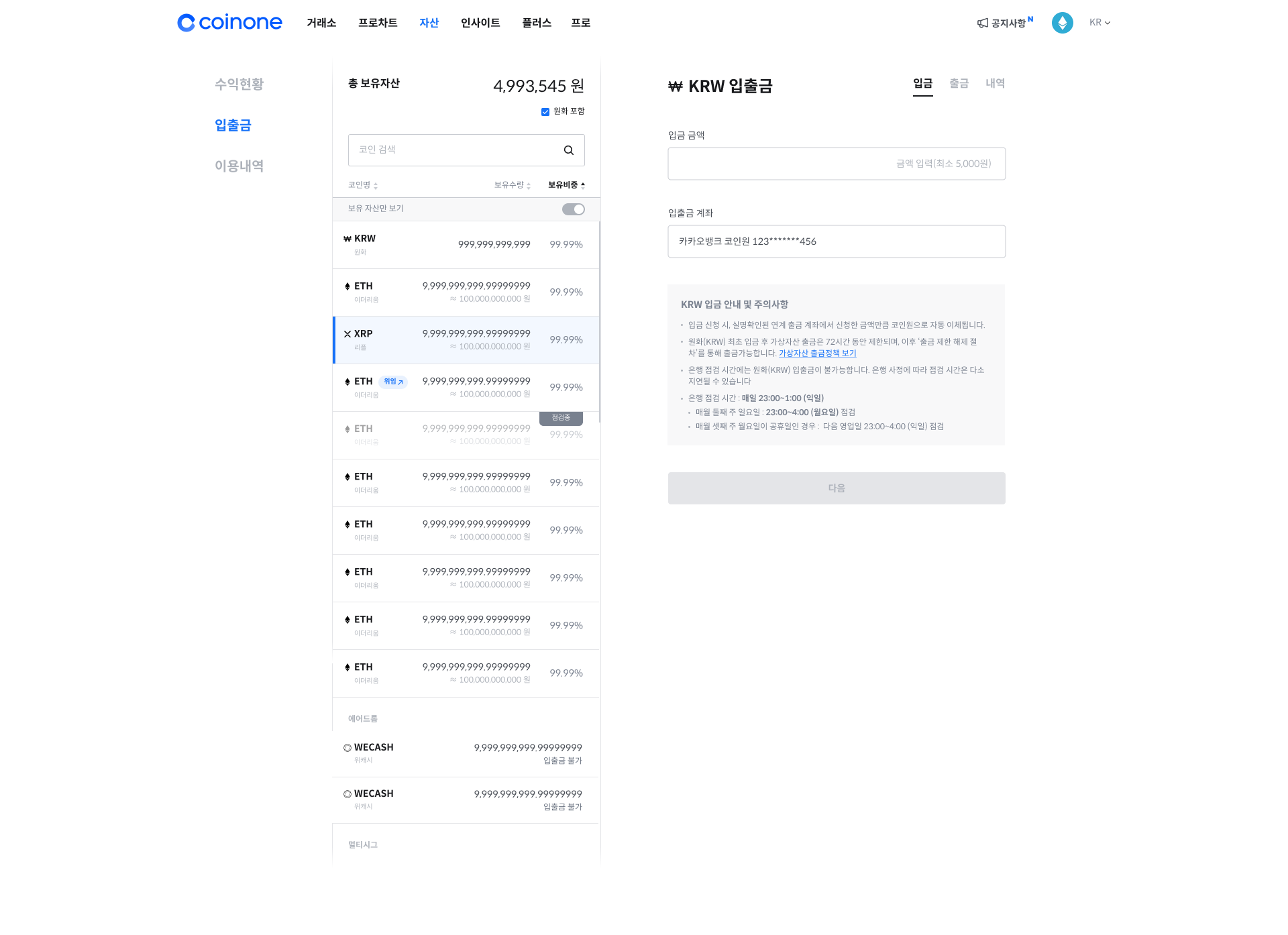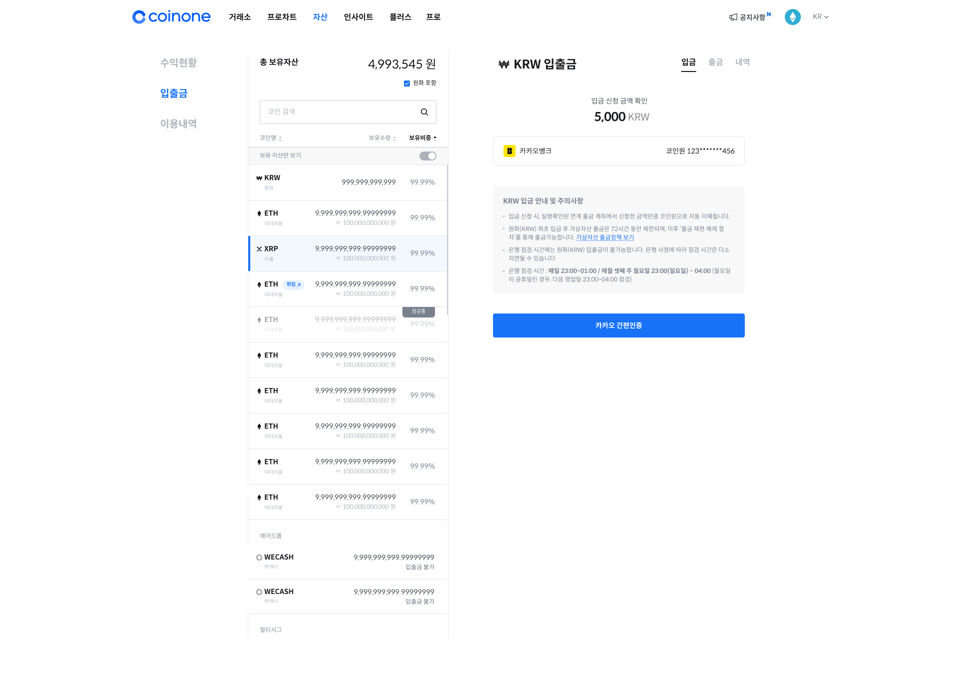 - 실명확인 입출금 계좌는 본인 명의 코인원 계정 1개에서만 인증 가능합니다.