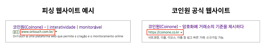 포털 사이트에서 주소창이나 검색창에 검색 키워드로 '코인원'을 입력했을 때 검색 결과 상단에 뜨는 피싱 사이트를 주의하시기 바랍니다. 보통 'coino-ne.com'이나 'coinon-e.com' 등의 도메인으로 되어있으며 광고대행사를 통해 피싱사이트로 접속을 유도합니다.