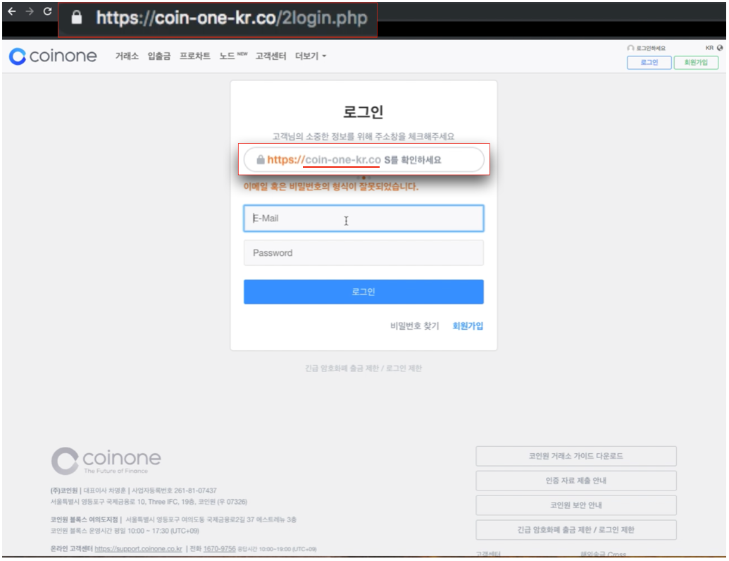 코인원 거래소 홈페이지 접속 시, 인터넷 브라우저 주소창에서 주소를 꼭 확인하시고 로그인해주시기 바랍니다.