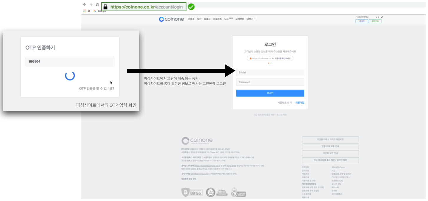 피싱사이트에서는 OTP 번호 또는 비밀번호 입력 시 지속적인 로딩 화면으로 확인되지만 동시간대에 해커는 피싱사이트에서 탈취한 정보로 코인원 거래소로 로그인을 하게 됩니다.