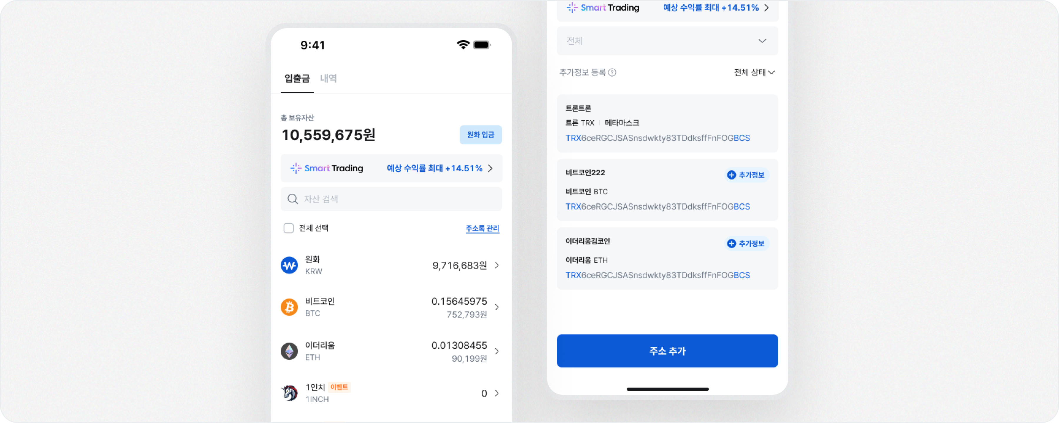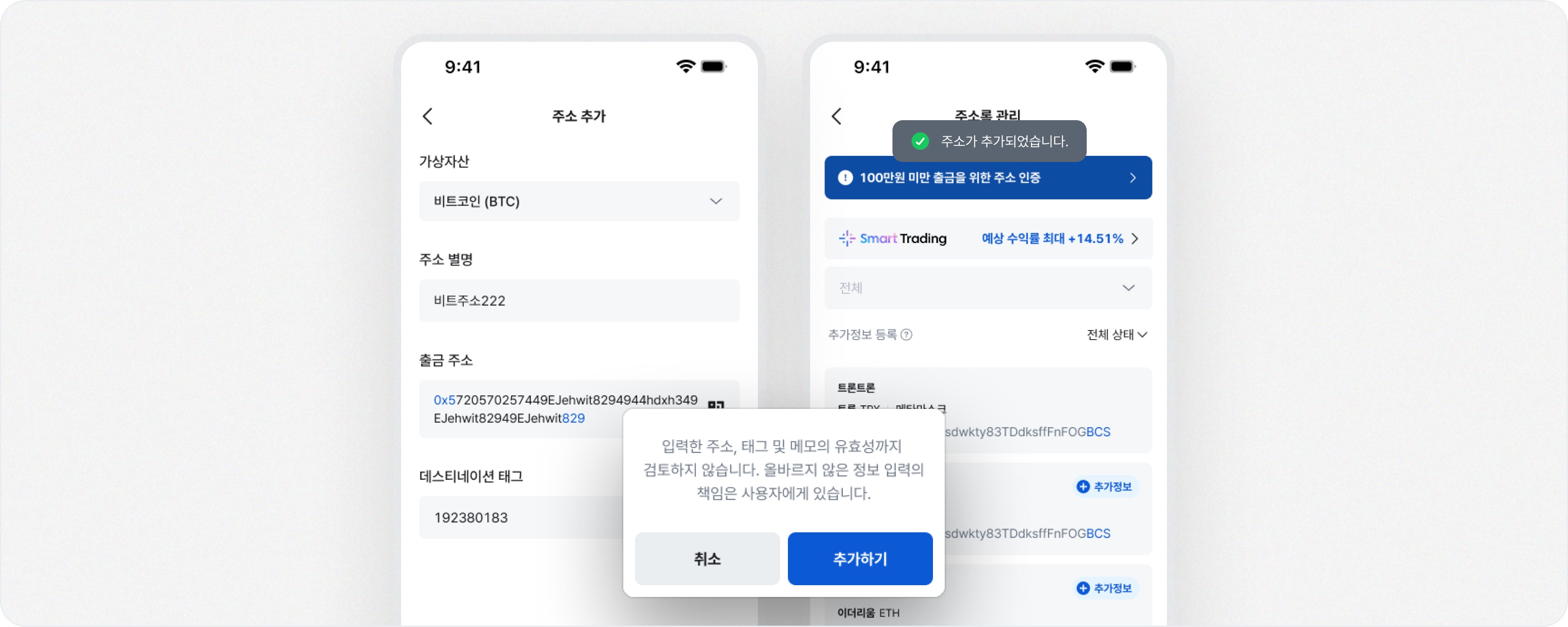 외부 주소의 경우, 주소록에서 추가정보 등록 완료 시 100만원 이상 출금이 가능합니다.