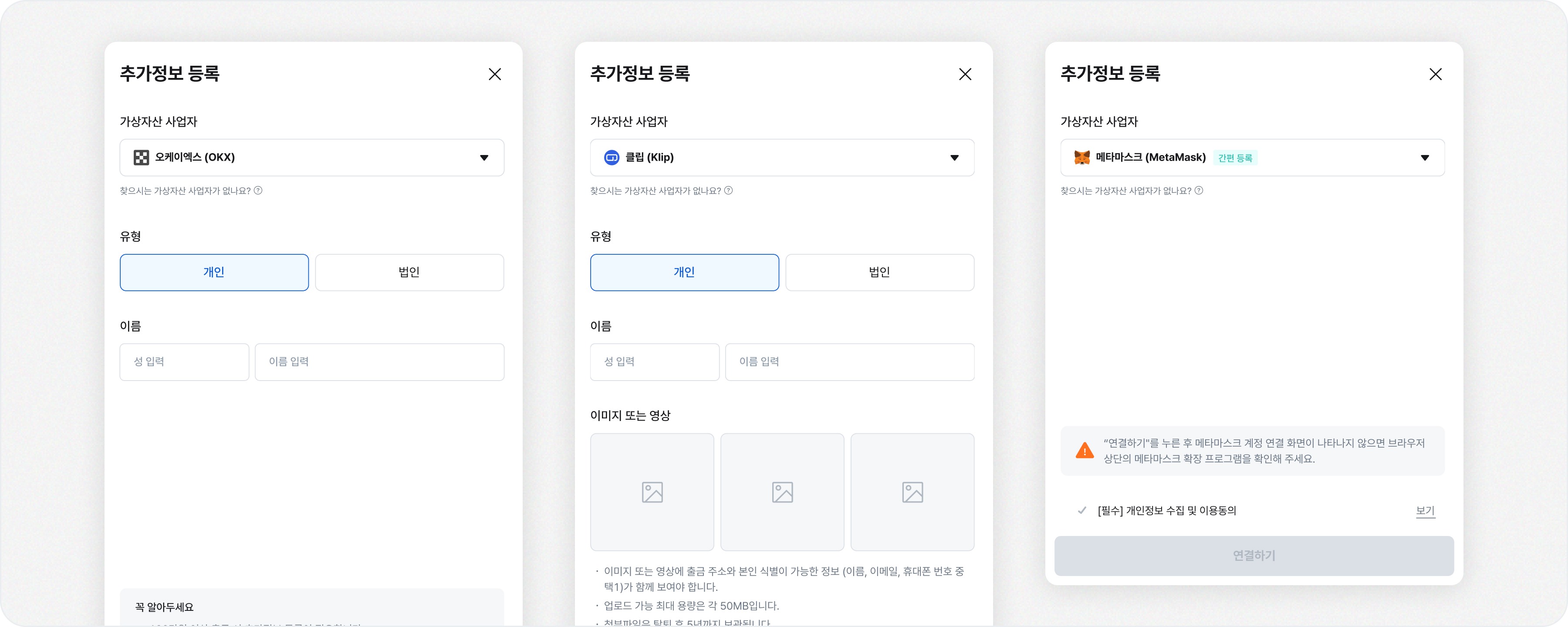 2. 1개 이상의 지갑 주소를 등록하기 원하실 경우 각 지갑마다 인증 자료를 첨부해주셔야합니다.