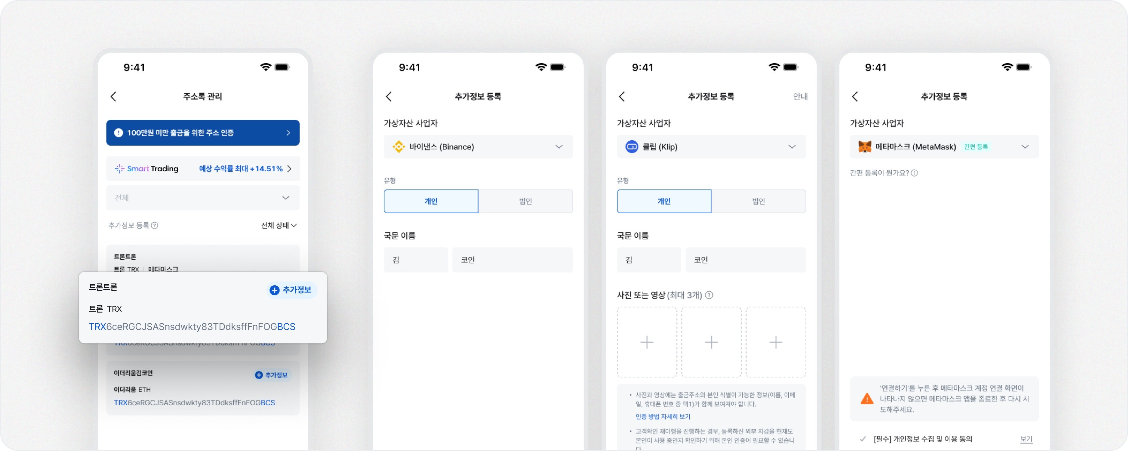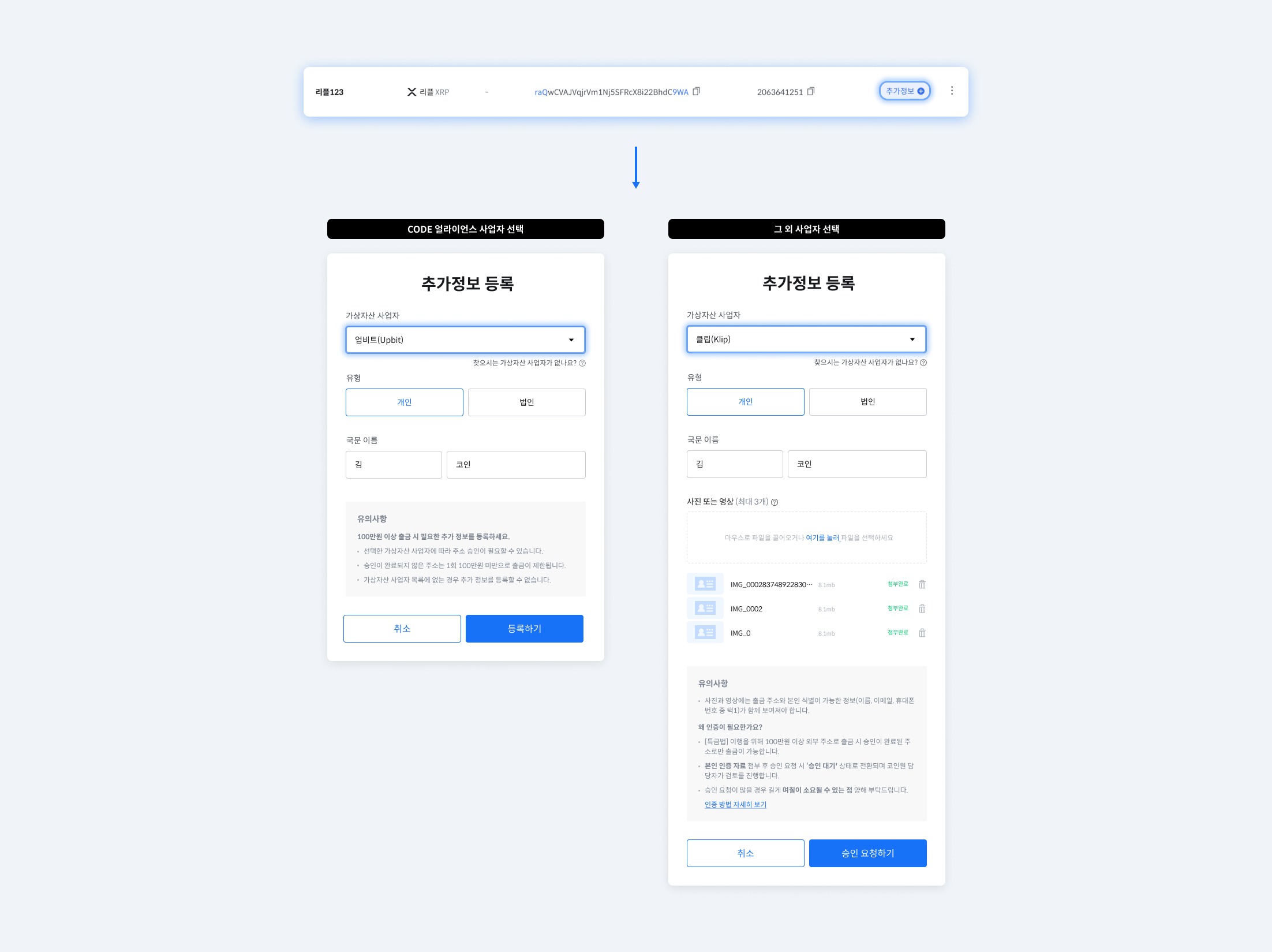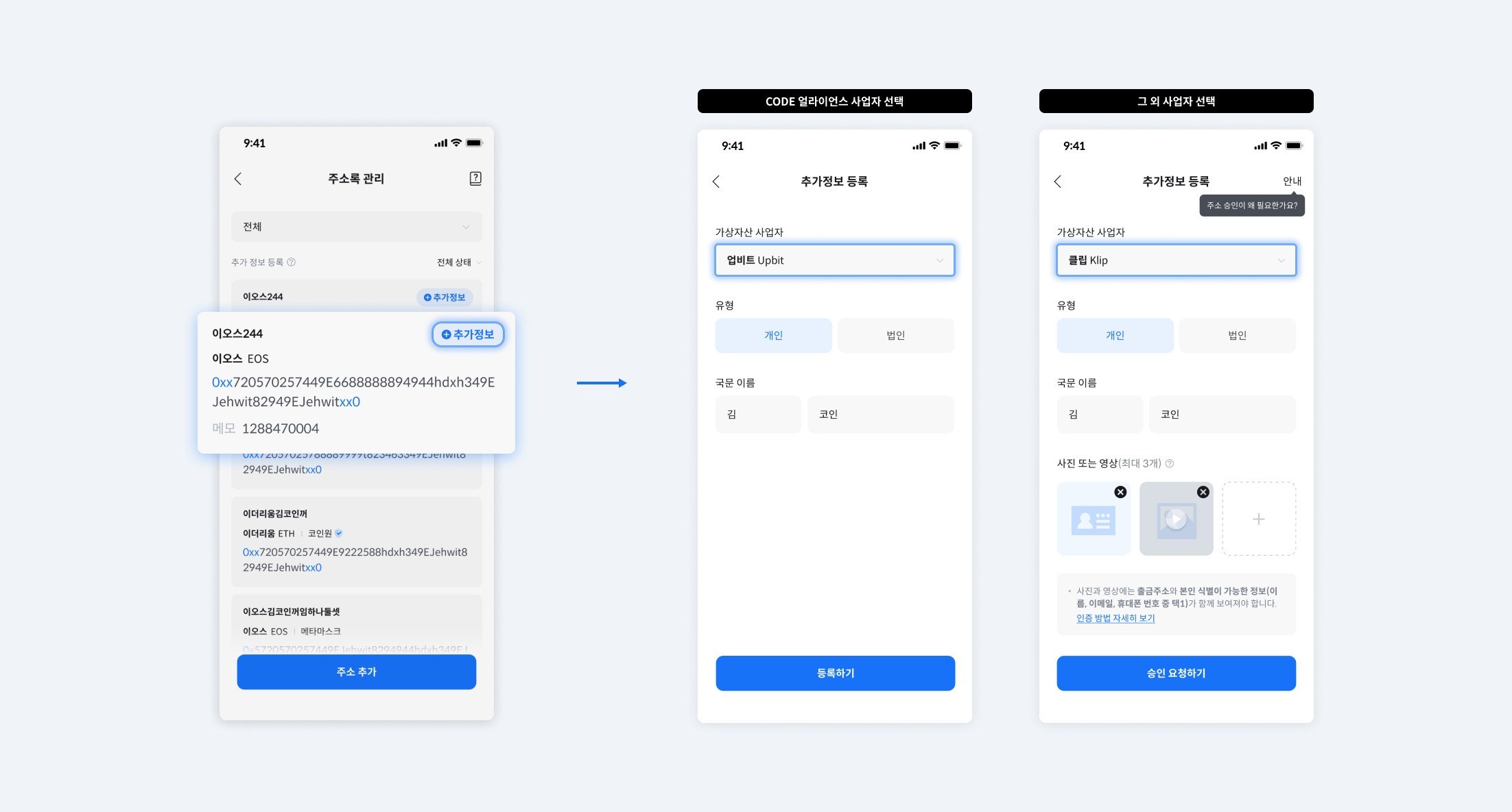 - CODE 얼라이언스를 제외한 가상자산 사업자의 추가 정보를 등록하기 위해서는 본인 식별정보(이름, 이메일, 휴대폰 번호 중 1개)가 포함된 출금주소의 이미지 또는 영상을 등록하여 인증과정을 거쳐야합니다.
