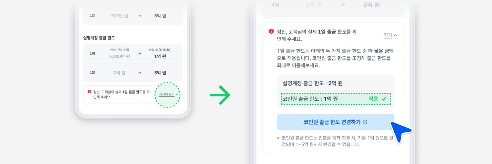 원화 출금 한도의 경우, 실명계정 출금한도와 코인원 출금한도 중 더 낮은 금액으로 적용됩니다.아래와 같이 코인원 출금 한도가 적용되어있다면, ‘코인원 출금 한도 변경하기’를 통해 즉시 실명계정 출금 한도 수준으로 한도를 상향할 수 있습니다. (코인원 출금 한도 변경 가이드 바로가기)