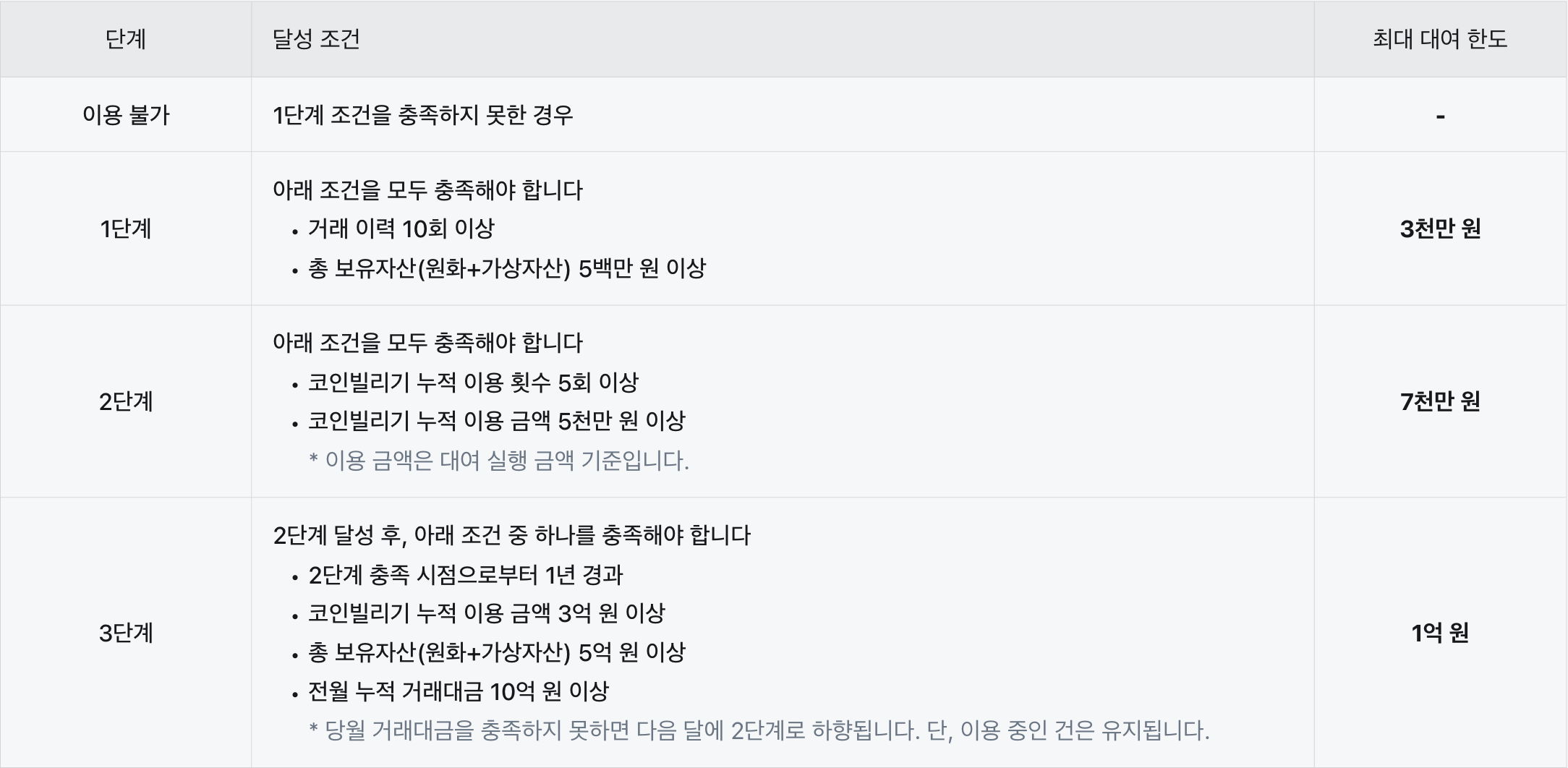 해당 한도는 가상자산사업자 신용공여 업무 가이드라인 제9조에 따라 운영되며, 단계별 조건 및 대여 한도는 달라질 수 있습니다.