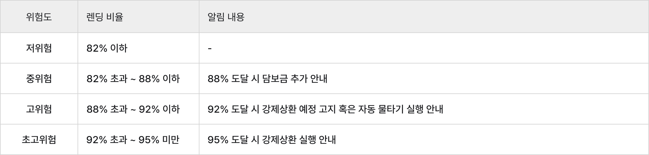 렌딩 비율(LTV)에 따른 위험 구간과 조치는 아래 표를 확인해 주세요.